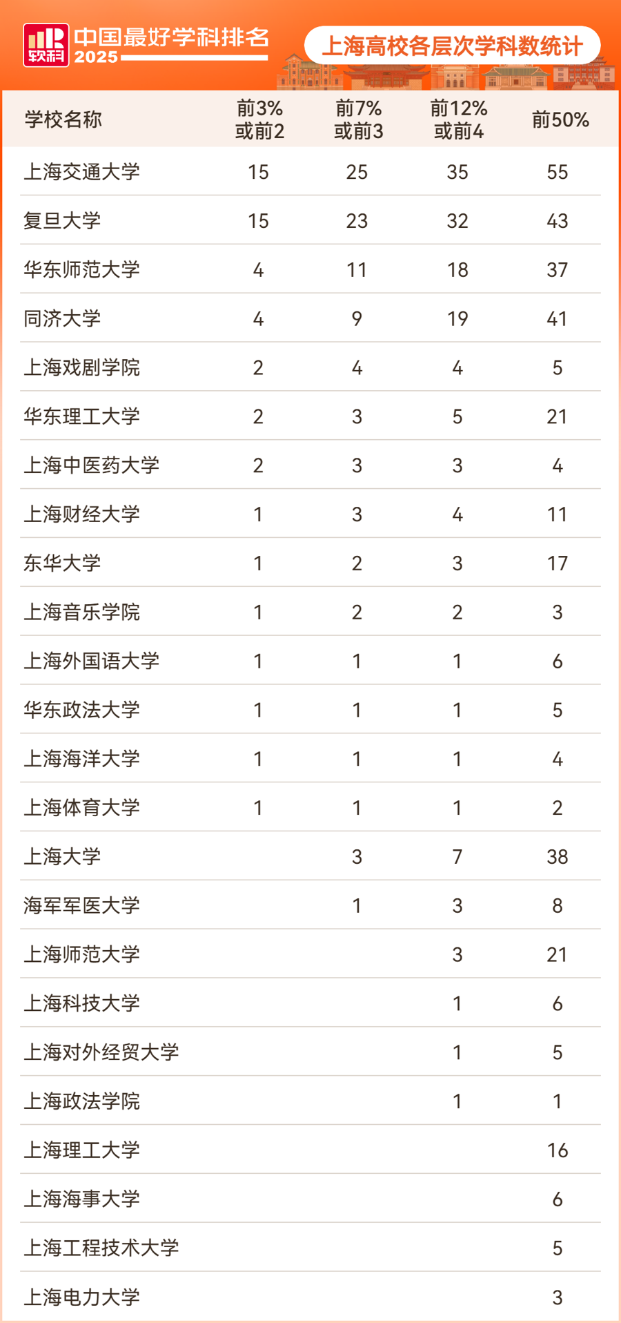 在中国顶尖学科(含一级学科和专业学位类别)分布上,上海市共拥有51个顶尖学科,其中复旦大学15个,哲学、政治学、基础医学3个学科排名全国第一;上海交通大学拥有15个,其中临床医学和生物医学工程2个学科排名全国第一;华东师范大学和同济大学均拥有4个顶尖学科,华东师范大学的统计学和软件工程、同济大学的土木工程和城乡规划学均位居全国第一。此外华东理工大学、上海戏剧学院、上海中医药大学各拥有2个顶尖学科;东华大学、华东政法大学、上海财经大学、上海海洋大学、上海体育大学、上海外国语大学、上海音乐学院各拥有1个顶尖学科;其中,华东理工大学的生物工程、上海戏剧学院的戏剧与影视、东华大学的纺织科学与工程、上海体育大学的体育学均为全国冠军学科。