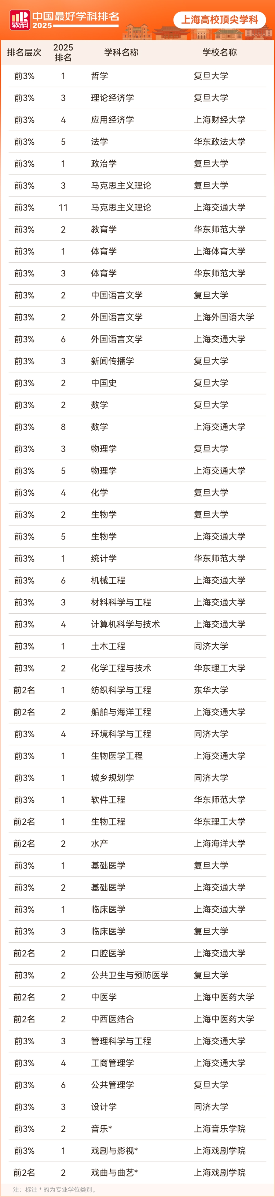 在上海拥有的51个中国顶尖学科(含一级学科和专业学位类别)中,复旦大学有15个顶尖学科,哲学、政治学、基础医学3个学科排名全国第一;上海交通大学也拥有15个,其中临床医学和生物医学工程2个学科排名全国第一;华东师范大学和同济大学均拥有4个顶尖学科,华东师大的统计学和软件工程、同济大学的土木工程和城乡规划学,均位居全国第一。